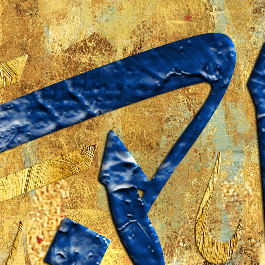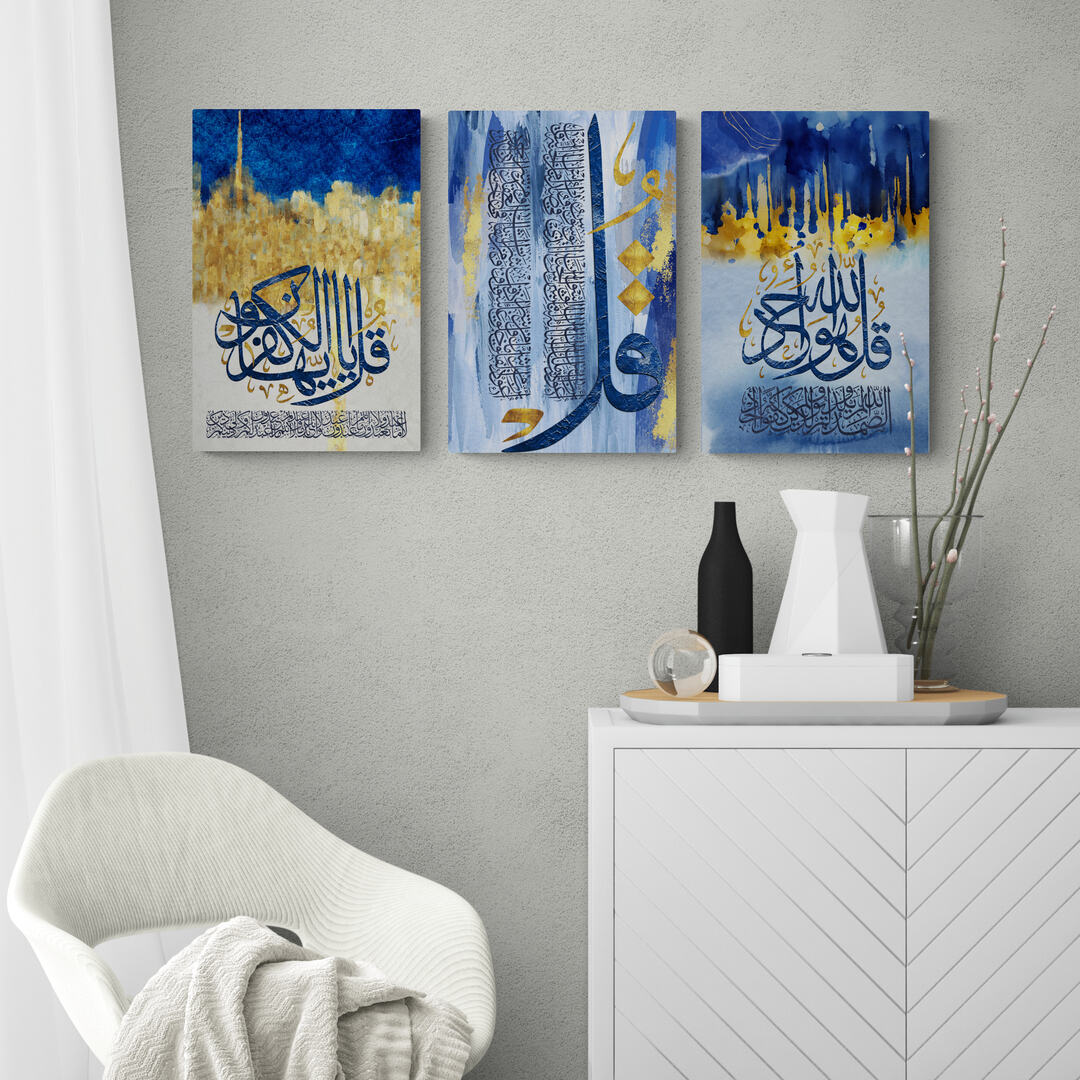 4 Quls-Modern ISLAMIC HOME DÉCOR-Blue Gold White and Gray-Thuluth-Giclée Fine Art Print